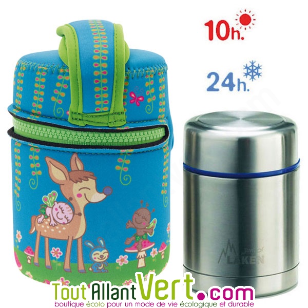 de LakenJolie lunch box isotherme en inox pour garder le repas au frais 24h ou au chaud 10h. Avec housse de protection Bleue illustrée de Biches. 100% étanche, elle ne craint pas les fuites! Large ouverture pour être remplie facilement. Capacité de 500 ml.