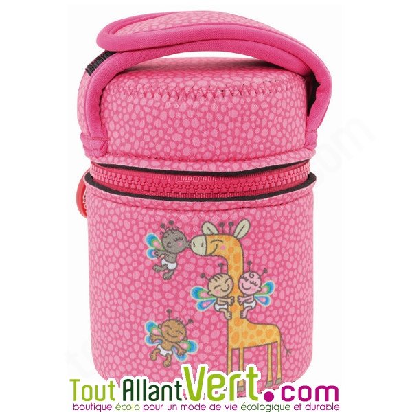 Lunch Box isotherme inox avec housse néoprène rose illustrée de girafes et de bébé papillons, 0,5L.- 100% étanche