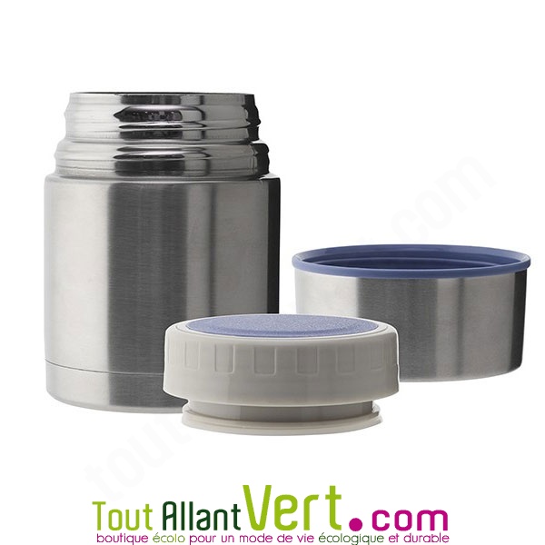 Elle a deux couvercles à visser à l'intérieur, un en inox et un en polypropylène étanche. Celui en inox peut servir de mini assiette ou pour partager son repas avec quelqu'un d'autre.