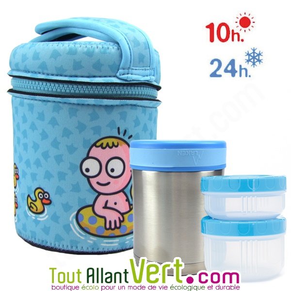 de LakenCette lunch-box adulte en acier inoxydable à double paroi est de qualité 18/8 alimentaire. Inclus : 2 compartiments étanches (250ml+375ml) + 1 housse de protection Bleu illustrée d'un petit baigneur entouré de canards. Garde votre repas au chaud 10h et au frais 24h. Elle peut s'utiliser avec ou sans les compartiments. Couvercle hermétique et étanche. Solide, ce porte-aliment est réutilisable et durable. Très belle qualité, vous serez entièrement satisfait! Marque Laken.