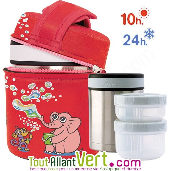 de LakenCette lunch-box adulte en acier inoxydable à double paroi est de qualité 18/8 alimentaire. Inclus : 2 compartiments étanches (250ml+375ml) + 1 housse de protection Rouge illustrée d'un éléphant et d'un singe. Garde votre repas au chaud 10h et au frais 24h. Elle peut s'utiliser avec ou sans les compartiments. Couvercle hermétique et étanche. Solide, ce porte-aliment est réutilisable et durable. Très belle qualité, vous serez entièrement satisfait! Marque Laken.