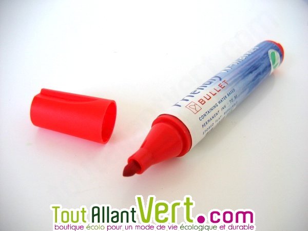 Encre permanente à l'eauCorps en papier recyclé et en cireSans solvantEncre rougePointe ronde (ogive)Labellisé "Nordic Ecolabel" (Suède)Traditionnellement, les marqueurs sont à base de Xylène, un produit très toxique. Sans solvant, ce marqueur est sans danger et peut écrire jusqu'à environ 6...Lire la suite...Autres produits susceptibles de vous intéresser