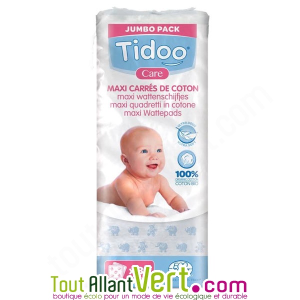 Maxi carrés ultra-doux en coton biologique pour nettoyer bébé. Format familiale, 80 lingettes. Facile à utiliser grâce à leur grande taille. Ne peluche pas et ne se dédouble pas. 11x8cm environ. Marque Tidoo.
