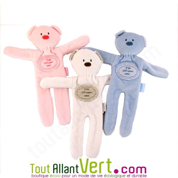 Nounours Ted en coton bio "I Like 100% organic cotton"Un joli nounours en coton bio qui servira de doudou, avec l'inscription " I like 100% organic cotton" (j'aime le 100% coton bio). Disponible en 3 coloris.