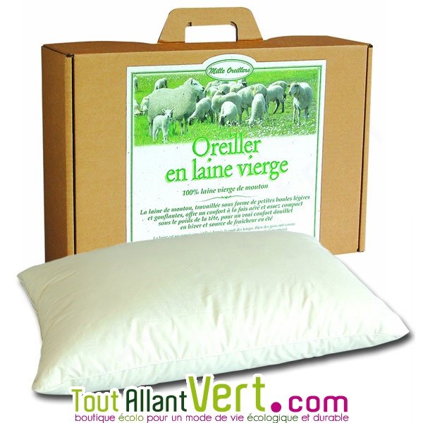 Oreiller en laine vierge, un garnissage souple, sain et compact avec des propriétés respirantes. Enveloppe 100% coton biologique. Fabrication Française.