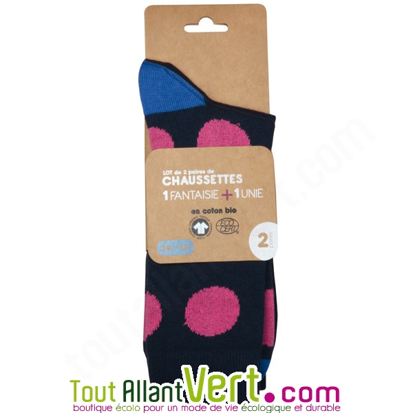 Prix de 2 paires chaussettes Femme 39-42 Coton Bio, uni marine et pois roses : 11.95€