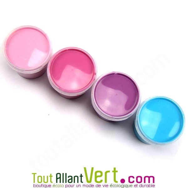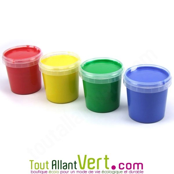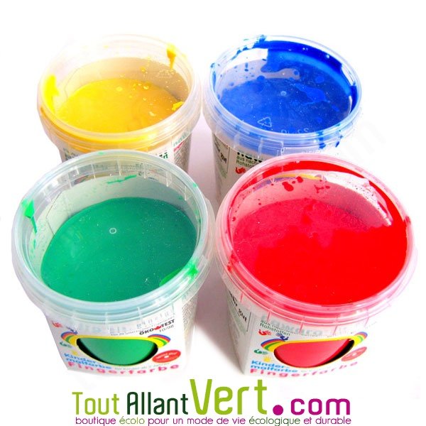 Cette peinture s'utilise avec les doigts, éponges, tampons... Elle possède un fort pouvoir couvrant et de belles couleurs vives et brillantes. Saine pour vos enfants, elle est composée de matières naturelles renouvelables. Tous les ingrédients sont agréés pour l'alimentation. Lavable à l'eau, elle est facile à enlever, même sèche. 4 pots de 150g. 3 lots de 4 pots aux couleurs différents. A partir de 3 ans.