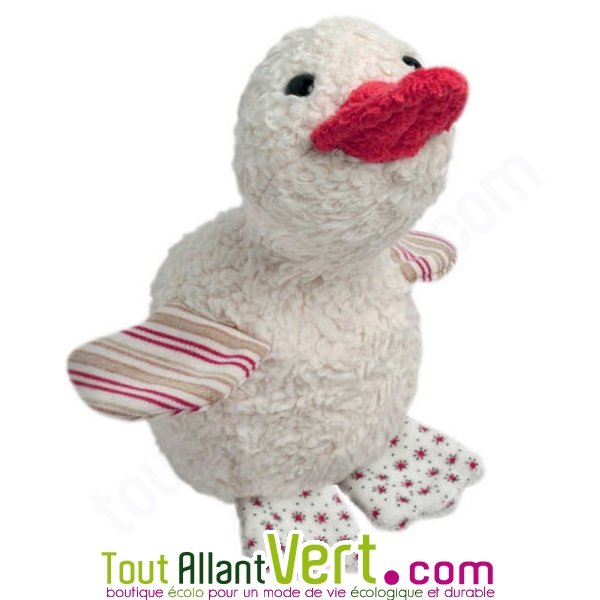 Peluche Canard en laine vierge et coton bio, 26 cmCette peluche en forme canard avec son bec rouge est un bon compagnon pour se blotir tout contre lui. En laine vierge, il est d'une douceur incomparable. Les pattes en coton bio ont une texture différente. Différentes sensations en une seule peluche, les couleurs douces en plus !