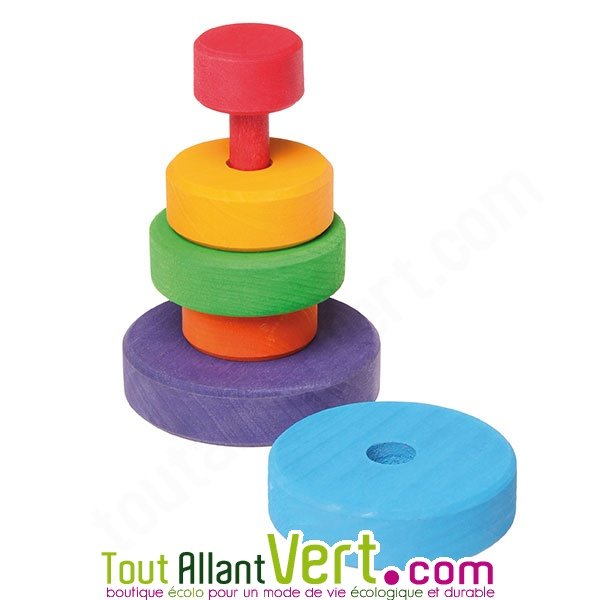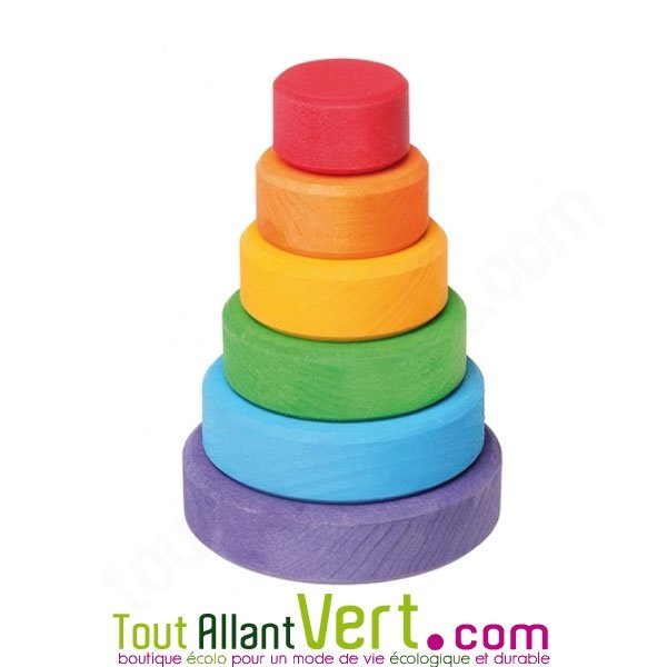 Petite tour ronde empliable en bois pour enfant.6 pièces sur cette grande tour conique en bois, les enfants peuvent trier, empiler et construire à volonté ! Elle est très colorée, ce qui attire petits et grands. Empiler fait travailler la coordination oeil-main et la motricité fine pour mettre le trou sur la tige.
