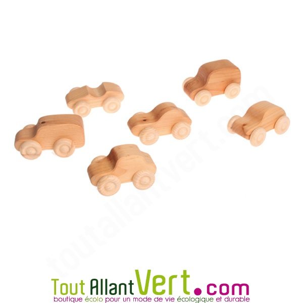 6 voitures en bois non coloré d'environ 10cm de Grimms- Convient dès la naissance.