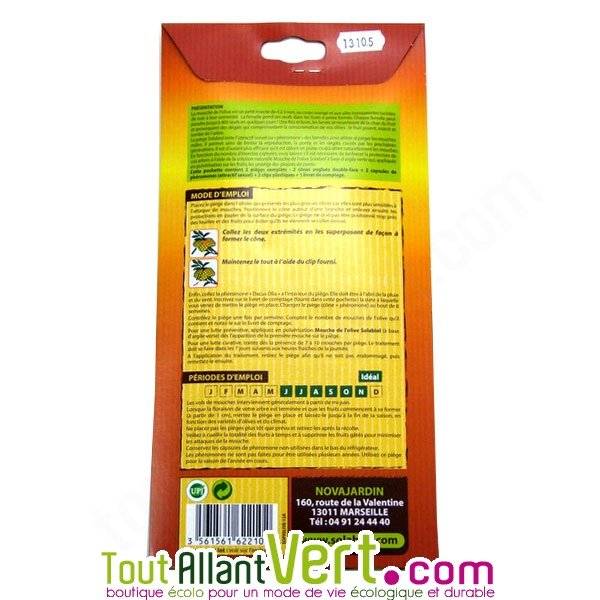 de SolabiolPour connaître à quel moment traiter de façon efficace ! Ces 2 pièges à mouche de l'olivier servent d'indicateur d'alerte. A utiliser dès que les fruits commencent à se former à partir de mi-juin. 2 pièges pour 2 arbres. Utilisable en agriculture biologique pour une lutte raisonnée. Marque Solabiol.