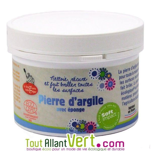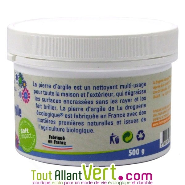 La pierre d'argile est le nettoyant écologique, naturel indispensable pour toute la maison et l'extérieur. Livré avec son éponge, ce pot de 500g durera plus de 8 mois. 100% biodégradable, la pierre d'argile dégraisse, nettoie, enlève le calcaire et fait briller sans rayer. Fabriqué en France.