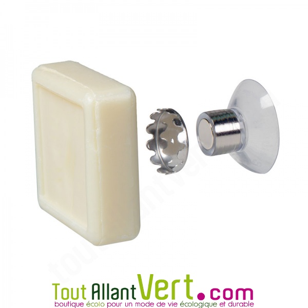 Grâce à ce porte-savon, votre savon solide sèche rapidement, est accessible facilement, ne tombe plus dans la salle de bain ou la douche. Hygiénique, simple à utiliser, ce porte-savon s'accroche à la paroi avec sa ventouse. Accroche inox anti-rouille qui s'enfonce dans le savon de votre choix pour ensuite s'aimanter sur le prote-savon. Réutilisable pour un savon de 170g! Fabriqué en Europe.