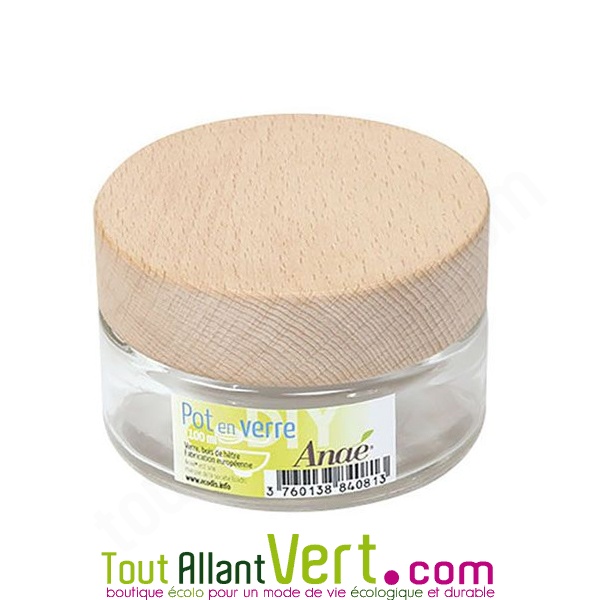 Pot en verre pour vos préparations cosmétiques faites maison (crèmes, huiles, laits et lotion...) . Verre transparent épais et solide. Verre et bois, matériaux inertes et naturels. Contenance: 100ml. Marque: Anaé.