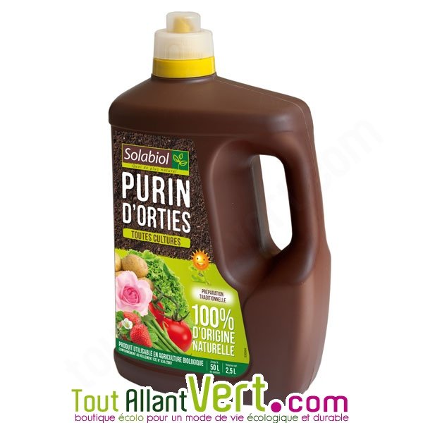 Purin d'ortie 2,5L, Solabiol.Riche en minéraux, oligo-éléments, vitamines, le purin d'ortie stimule la croissance des plantes et leur fonction chlorophyllienne. Utilisé en pulvérisation et arrosage, il renforce les résistances naturelles des plantes aux maladies et parasites, avec une effet répulsif sur les pucerons notamment. Le purin d'ortie est issu de la macération d'ortie.