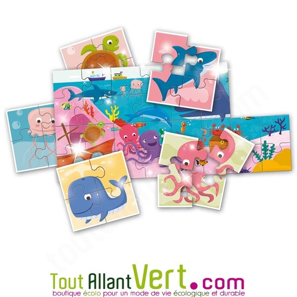 Un puzzle amusant pour les jeunes enfants avec d'un côté 8 animaux marins et de l'autre une belle illustration représentant la vie sous-marine. Les puzzles sont réalisés avec de grandes pièces de grosse épaisseur adaptées aux enfants les plus petits.