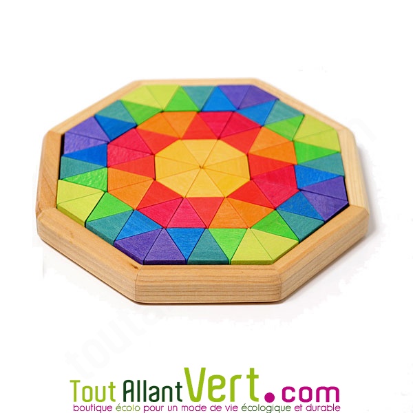 de GrimmsPuzzle créatif et petit casse-tête dans un octogone. 72 pièces triangles de couleurs en bois de forêts gérées durablement. Dimension triangle : 2,3cm x 2,3cm x 1,8cm x 1cm. Dimension 16cm. A partir de 3 ans. Marque Grimm's.