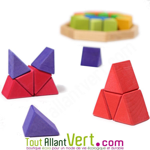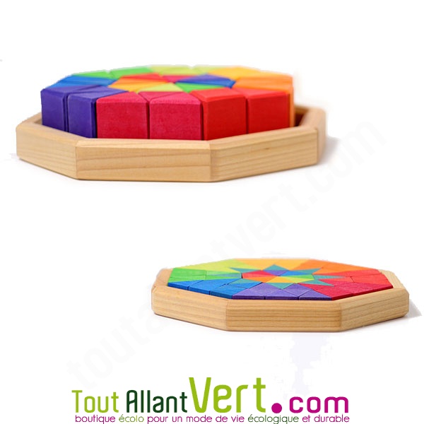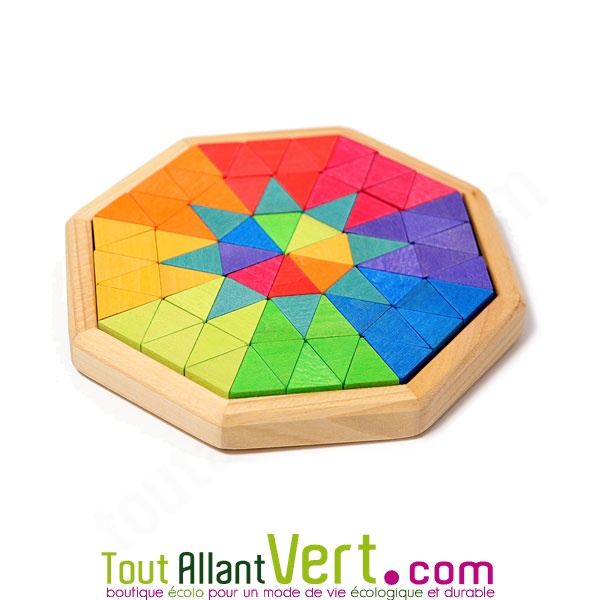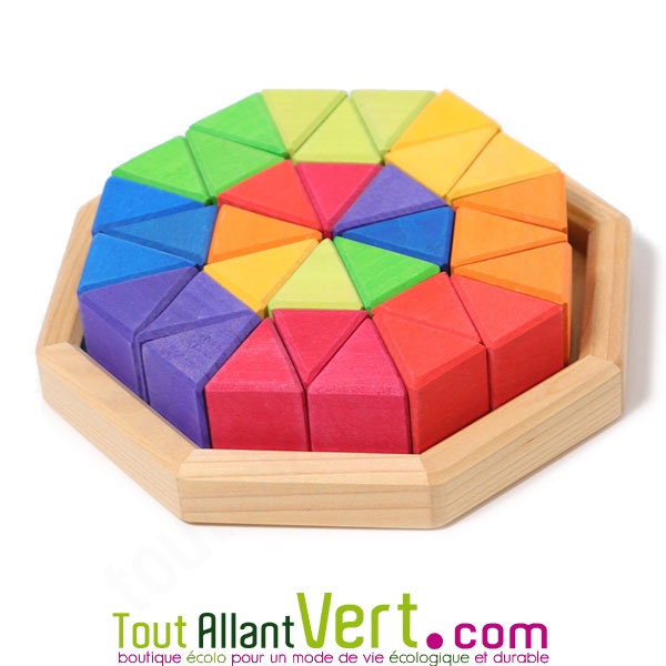 Puzzle créatif et casse-tête multicolore en bois dans un octogone. Pièces triangles de couleurs en bois de forêts gérées durablement. 2 tailles au choix : 16cm pour 72 petites pièces ou 22cm pour 32 grandes pièces. A partir de 3 ans. Marque Grimm's.