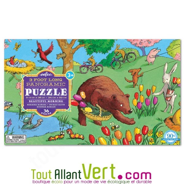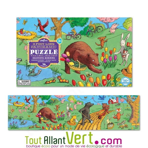 Joli puzzle "un beau matin" illustré d'animaux s'amusant dans un près. Un jeu reposant et ludique pour les enfants de 3 ans et plus. Fabriqué à partir de 90% de carton recyclé. 36 grandes pièces, format géant panoramique 91.5 x 24cm.