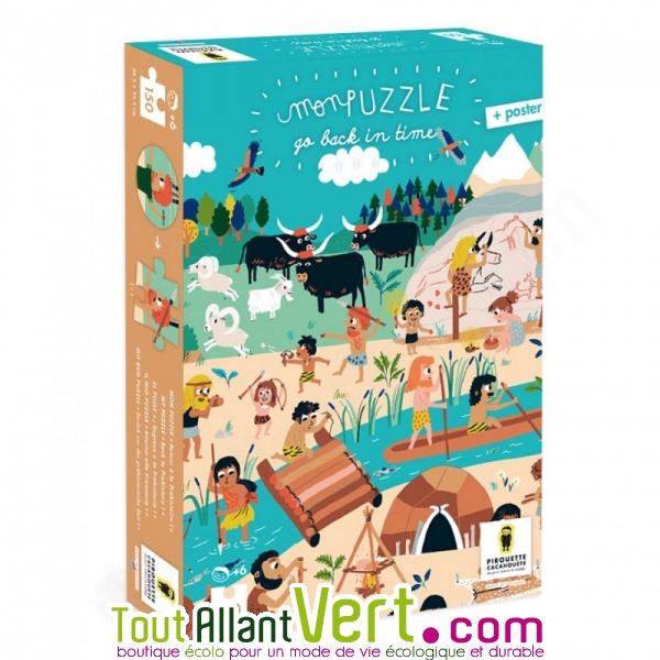 Très joli puzzle intitulé "Go back in Time" (Retour dans le temps) sur le thème de la préhistoire. Original, le poster représente la même situation mais à notre époque actuelle. 150 pièces. Fabriqué en Paysè-Bas par Pirouette et Cacahouète.