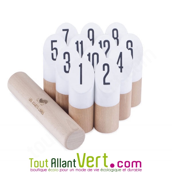 Le célèbre jeu de quilles Finlandaises, élégant et design, est fabriqué en bois de hêtre à la main dans le Jura. Il est accompagné de son sac en coton biologique et vous permettra de bonnes parties en plein air en famille ou entre amis.Les plus écolos :