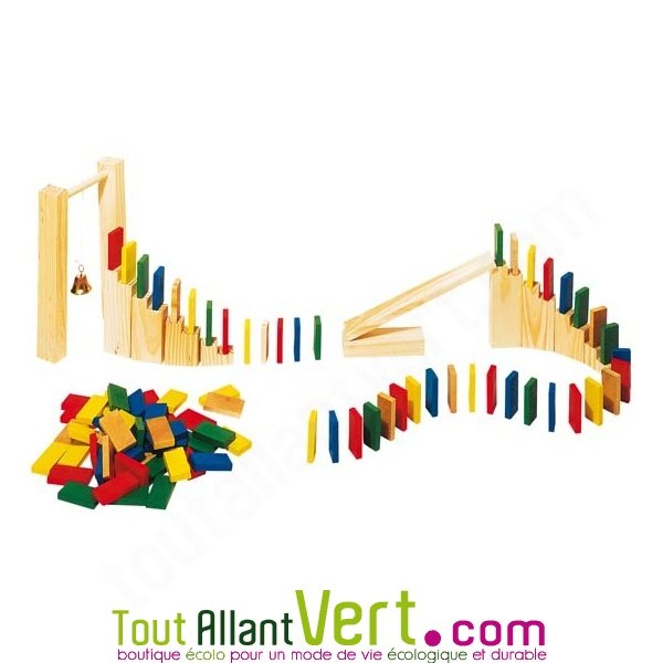 Rallye des dominos 250 pièces, Toys Pure.Des pièces en bois pour construire des parcours farfelus et arriver à faire tomber les dominos en cascade jusqu'à la cloche !