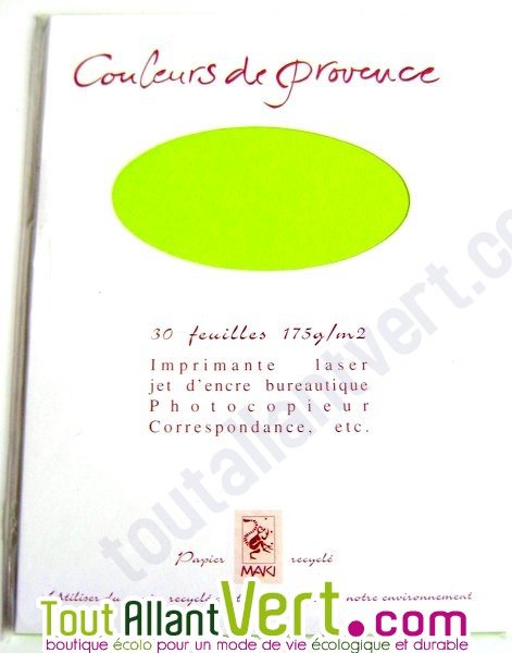 ★ ★ ★ ★ ★1 avis clients100% recyclé Colorants non toxique, sans chlore Couleur : vert printemps Dimensions : A4 (21 x 29.7 cm), 175g/m², 30 feuilles Compatible imprimante, photocopieurs et crayons Une déco de table avec des petits "cartons-prénom" ou un menu personnalisés? Des lettres, des invitations originales? De la couleur pour vos albums photos, vos collages, vos créations? Une envie ...Ce produit ne fait plus partie de notre catalogueCet article n'est plus disponible à la vente chez nous.Découvrez d'autres produits