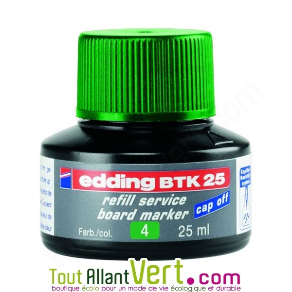 Cette recharge d'encre vert BTK25 rechargent les marqueurs vert Edding 28 pour tableaux blancs rechargeables et recyclés. 25ml
