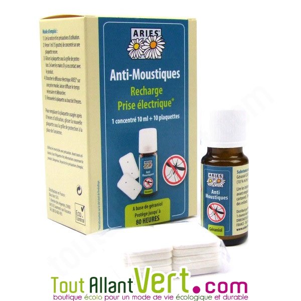 Cette recharge destinée au diffuseur prise électrique anti-moustiques ARIES contient 10 plaquettes et 10ml de concentré. Protège efficacement votre intérieur jusqu'à 80h. A base de Géraniol, subtance active naturelle. Fabriqué en Allemagne.