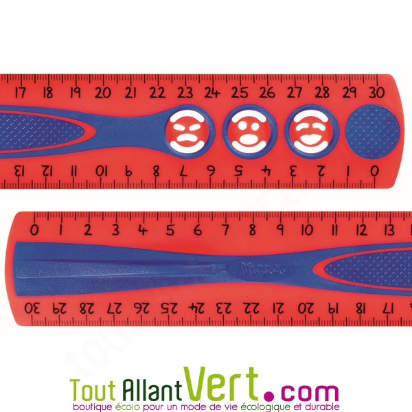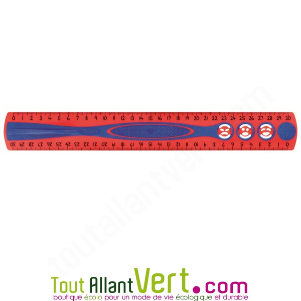 Cette règle rougeet bleue de 30 cm est flexible. Ecologique, elle est fabriquée à partir de bouteilles d'eau recyclées à 60%. Idéal école avec ses grip anti-dérapant qui empêche la règle de glisser sur le papier lors du traçage. Parfait pour apprendre à faire de beaux traits. Colorées, elles sont attirantes pour les enfants. Graduée en cm sur les 2 bords. Poignée de préhension.