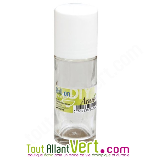 Roll on vide pour fabriquer son déodorant avec application sur le corps via la boule du roll-on. Faites votre composition et mettez là dans ce contenant/emballage vide réutilisable. Contenance 50ml.. Diamètre: environ 4.5cm x Ht 11.5cm (avec le bouchon). Marque: Anaé.
