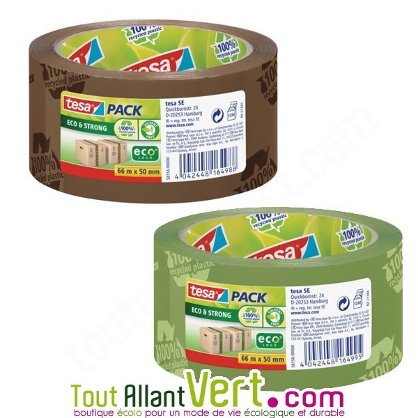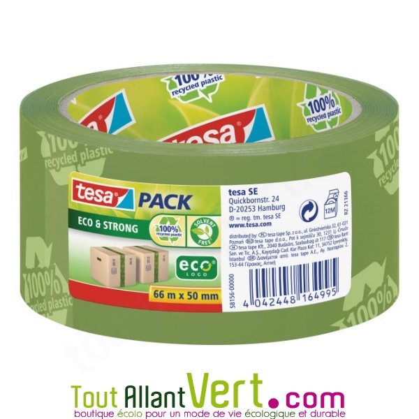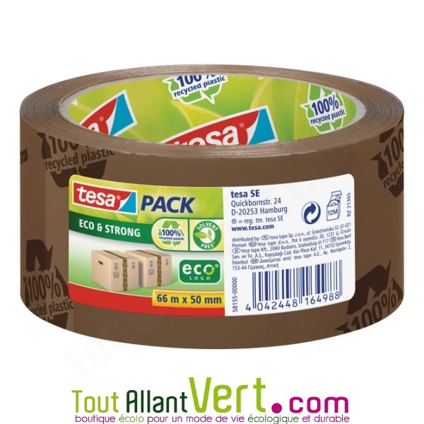de TesaRuban adhésif 50 microns en plastique recyclé. Ce gros ruban adhésif est en plastique 100% recyclé et c'est écrit dessus ! Résistant et sans solvant, il emballera tous vos colis, cartons, sacs, ou autres... avec une touche écolo. Existe en vert ou marron. Message sur le ruban : "100% recycled plastic" Epaisseur: 50 mi...Ce produit ne fait plus partie de notre catalogueCet article n'est plus disponible à la vente chez nous.Découvrez d'autres produits