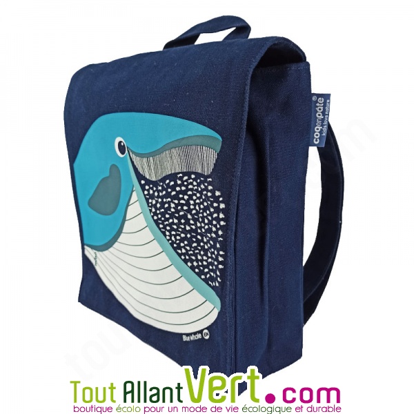 Sac à dos enfant en coton biologique, idéal maternelle. Fermeture par deux aimants, poche intérieure, bretelles ajustables et poignée. Baleine bleue et petits poissons sur le devant, fond bleu nuit. 23 x 23 x 7.5 cm.
