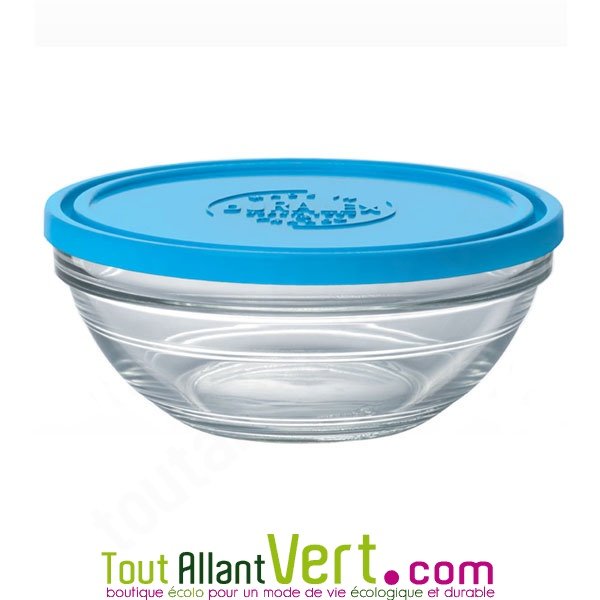 Saladier rond pour la conservation. En verre trempé avec couvercle bleu. Diamètre 14cm x H5,7cm. Capacité de 50cl. Durable, il est résistant aux chocs, passe au micro-ondes et au lave-vaisselle (sans le covercle). Empilable pour un gain de place. Garanti sans Bisphénol A. Fabriqué en France.