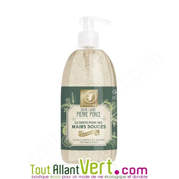 Fabriqué à base de pierre ponce, ce savon liquide bio nettoie et exfolie les mains en douceur. Il contient également de l'aloe vera et un mélange d'huiles essentielles de bergamote, petit grain et vétiver qui dégagent un parfum envoûtant. 500ml. Conçu et fabriqué en France par Boutique nature.