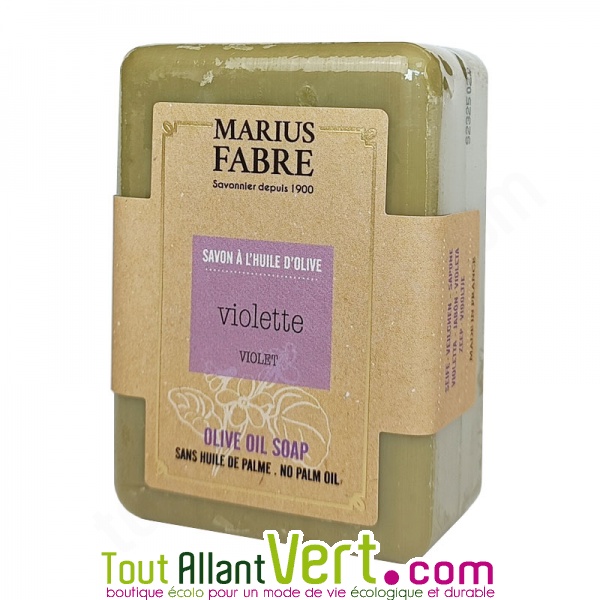 Savon de Marseille parfumé à la violette. A base d'huile d'olive et enrichi au beurre de karité, ce savon est doux pour la peau. Biodégradable, sans huile de palme, ni colorant. Fabriqué en France par Marius Fabre. 150g
