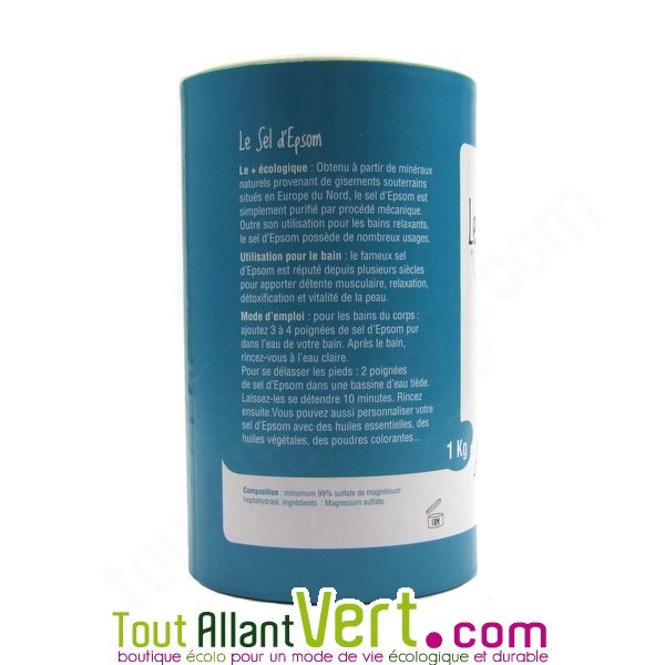Sels de bain d'Epsom, 1Kg.Relaxant, aide au repos et détente musculaire.Détoxifiant et revitalise la peau.Exfoliant pour la peau.Le sel d'Epsom est réputé depuis des siècles pour apporter détente musculaire, relaxation, détoxification et vitalité à la peau. Il est parfait dans un bain avant d'aller se ...Lire la suite...Informations supplémentairesAutres catégories pour ce produit:SUGGESTIONS DE PRODUITSDescription