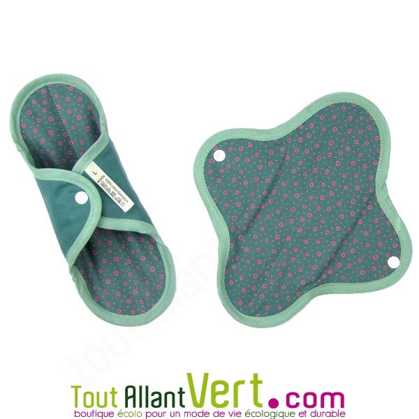 Serviette périodique et hygiénique lavable en coton biologique Turquoise avec motifs rose, Maxi, lot de 2 serviettes.Idéales pour remplacer les serviettes périodiques jetables ! Une protection sûre, écologique et économique !