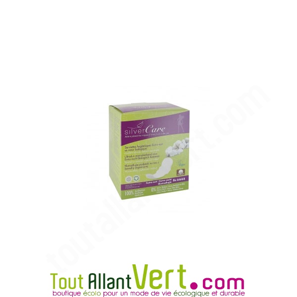 de SilvercareServiettes hygièniques en coton pur Silvercare. Extra Spécial NUIT. Grâce à son coton extra pur et à sa finesse, sans parfum, sans chlore, ce sserviettes sauront vous apporter confort et protection afin de vous garantir une nuit sans soucis ! Adaptés pour flux abondants.