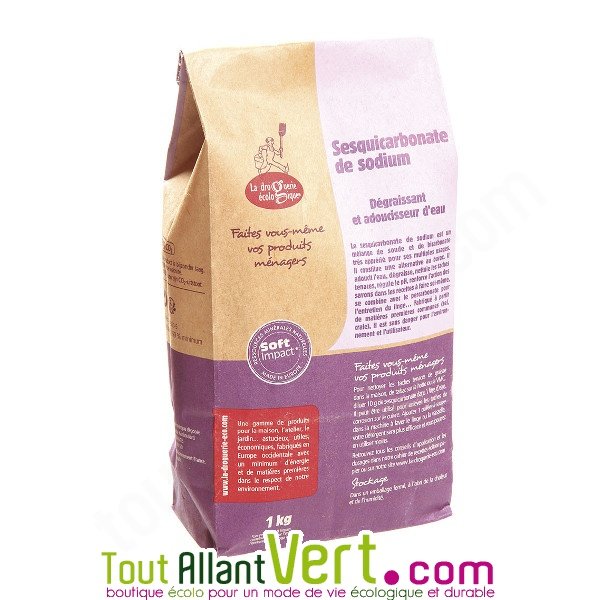 Mélange Bicarbonate de soude+soude de cristaux = sesquicarbonate de sodium, 1kgLe sesquicarbonate allie le caractère abrasif du bicarbonate de soude avec le caractère dégraissant de la soude en cristaux. Un produit "miracle" utilisé en droguerie familiale pour adoucir l'eau, dégraisser, nettoyer les tâches tenaces, réguler le pH, renforcer l'action des savons dans les recettes maison... Il est aussi utilisé comme adoucisseur d'eau dans les régions à eau calcaire. Il peut également se combiner avec le percarbonate pour l'entretien du linge.