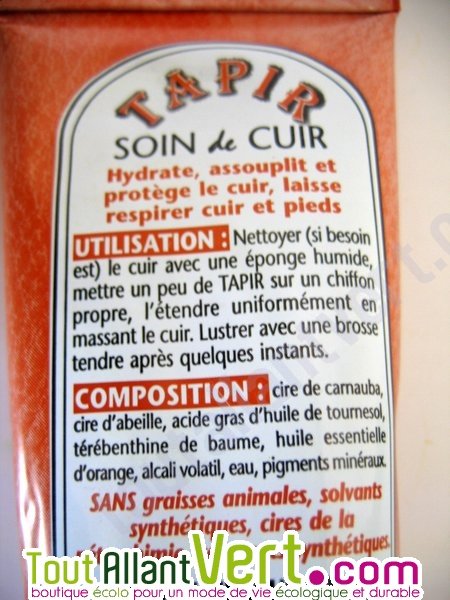 Le fabricant : Tapir est une société qui utilise des cires et des huiles naturelles. Elle refuse d'employer les huiles et les cires issues de la pétrochimie, les graisses animales, les solvants, les colorants et les conservateurs synthétiques dans la fabrication de ses produits. Les produits Tapir laissent respirer le cuir et les pieds car ils ne contiennent pas de polyuréthane, un produit qui bouche les pores.
