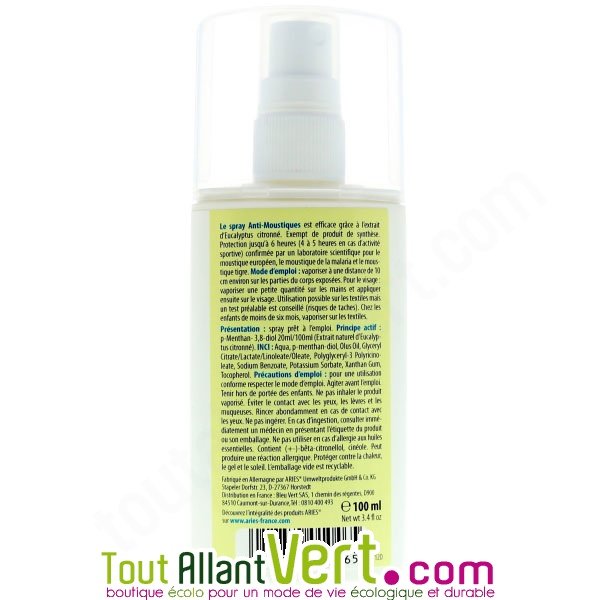 Pour les enfants de moins de 3 ans, vaporiser les vêtements, pas sur la peau. (faites un test au préalable sur une petite partie pour les tâches éventuelles sur le textile)Composition : synergie d'essence extraites de l'Eucalyptus citronné (Citridiol). Solution hydoalcoolique.