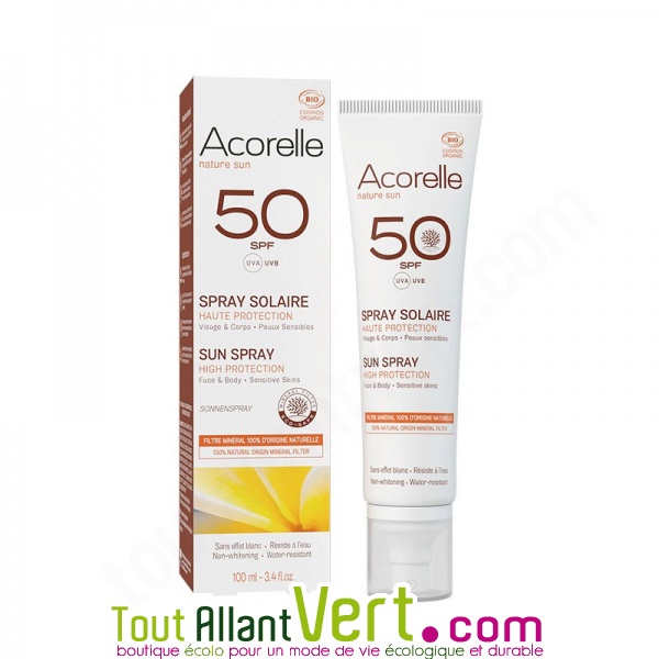 Spray solaire indice 50. Idéal pour les peaux claires et sensibles. En spray, c'est plus pratique et rapide ! Sans effet blanc. Filtre minérale d'origine naturelle. Haute protection UVA et UVB. Résiste à l'eau. Pour adultes et enfants de plus de 3 ans. Spray de 100ml. Certifié cosmétique biologique. Fabriqué en France. Marque Acorelle.