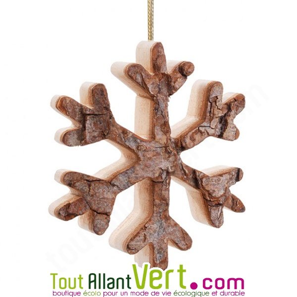 Cette suspension de Noël est un Flocon de neige découpé dans un tronc d'arbre. Un côté écorce et un côté bois poli. H6cm environ. Découpée au laser pour une très grande précision, elle est fabriquée en Allemagne dans du bois de coupe local. En bois, matériau solide et renouvelable, vous garderez cette décoration de nombreusese années.