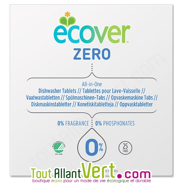 de EcoverTablettes lave-vaisselle Tout-en-Un Ecover "Zéro". Nettoyage puissant. Ingrédients d'origine végétale et de minéraux. 0% parfum, colorant ou chlore et 0% phosphonates. Formulé pour minimiser les risques d'allergies. Marque Ecover.