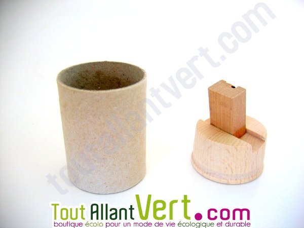 Le bois est un produit naturel très résistant. Celui de ce taille-crayon est non traité avec des produits chimiques. Le réservoir est en carton recyclé. Solide, il recevra tous les copeaux.