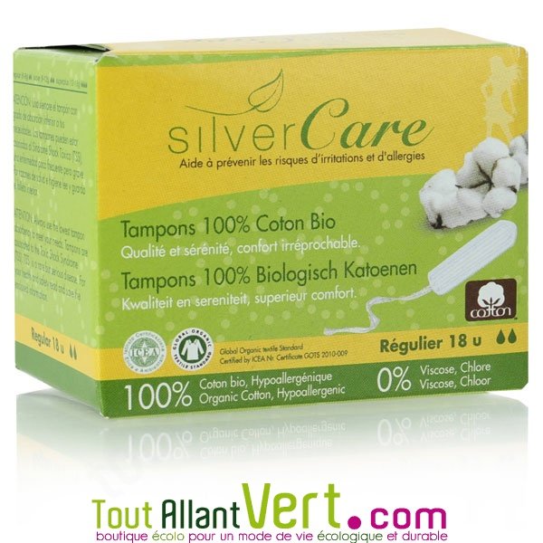 Tampons hygièniques en coton bio, lot de 18, Silvercare. Flux Régulier.Cœur absorbant 100 % pur coton biologique certifié.Hypoallergéniques pour réduire les risques d'irritation et d'allergie.Voile de protection spécial couvrant le cœur absorbant afin d'éviter l'adhérence des fibres à l&...Lire la suite...Livraison pour Noël garantie en choisissant Chronorelais pour toute commande payée jusqu'au mardi 23/12 11h00.
