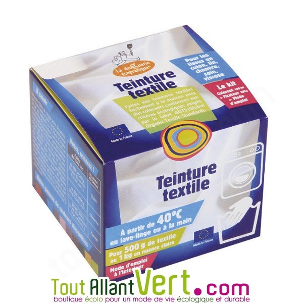 Donnez une nouvelle vie à vos vêtements! Cette teinture est utilisable en machine ou à la main à partir de 40° pour les tissus en coton, lin, chanvre, soie, jute et viscose. Kit comprenant le colorant (100ml), un fixateur (100g) et le mode d'emploi. Pour 500g de textile ou 1kg en nuance claire. Résultat garanti! Existe en plusieurs couleurs au choix. Fabriqué en France.