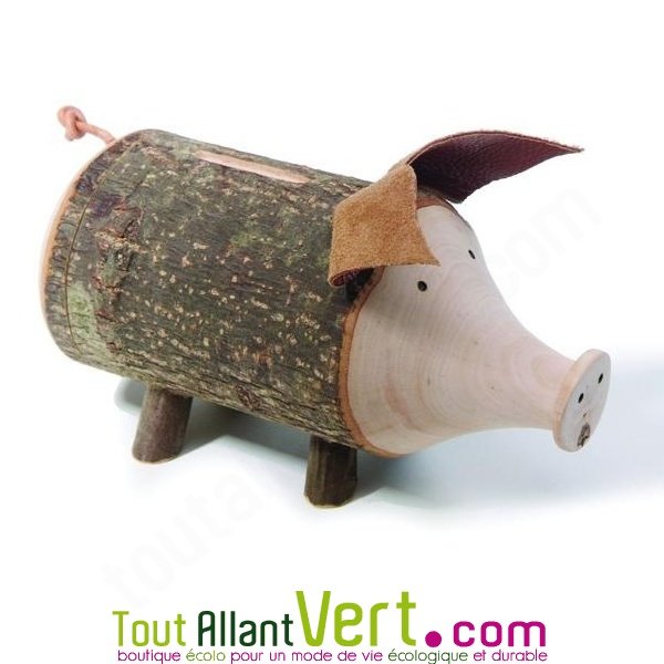Le fond du cochon s'ouvre pour pouvoir retirer l'argent économiser. Et il sent bon le bois et la forêt !