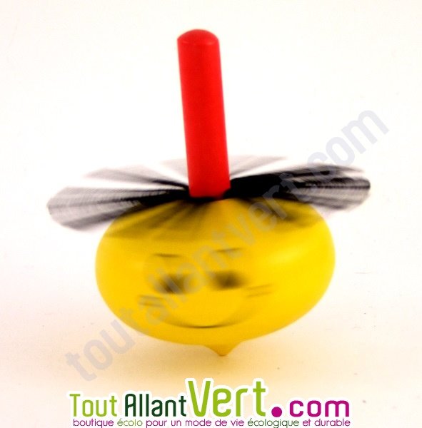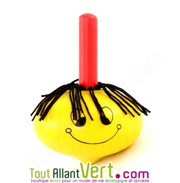Toupie jaune en boisCette toupie jaune nous sourit ! En bois provenant de forêts gérées durablement et certifié, cette toupie est sympathique avec ses cheveux qui volent quand la toupie tourne.